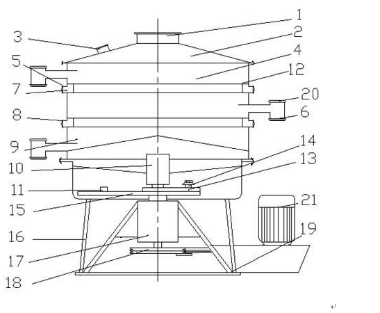1. 觀察口 2.出料口 3.底框 4. 驅(qū)動(dòng)軸 5.拉簧 6.加油口 7.主軸 8.底座 9.皮帶輪 10.皮帶11.電機(jī) 12. 偏心機(jī)構(gòu) 13.防護(hù)罩 14.加油口 15.鎖緊裝置 16.篩格 17.密封蓋 18.進(jìn)料口