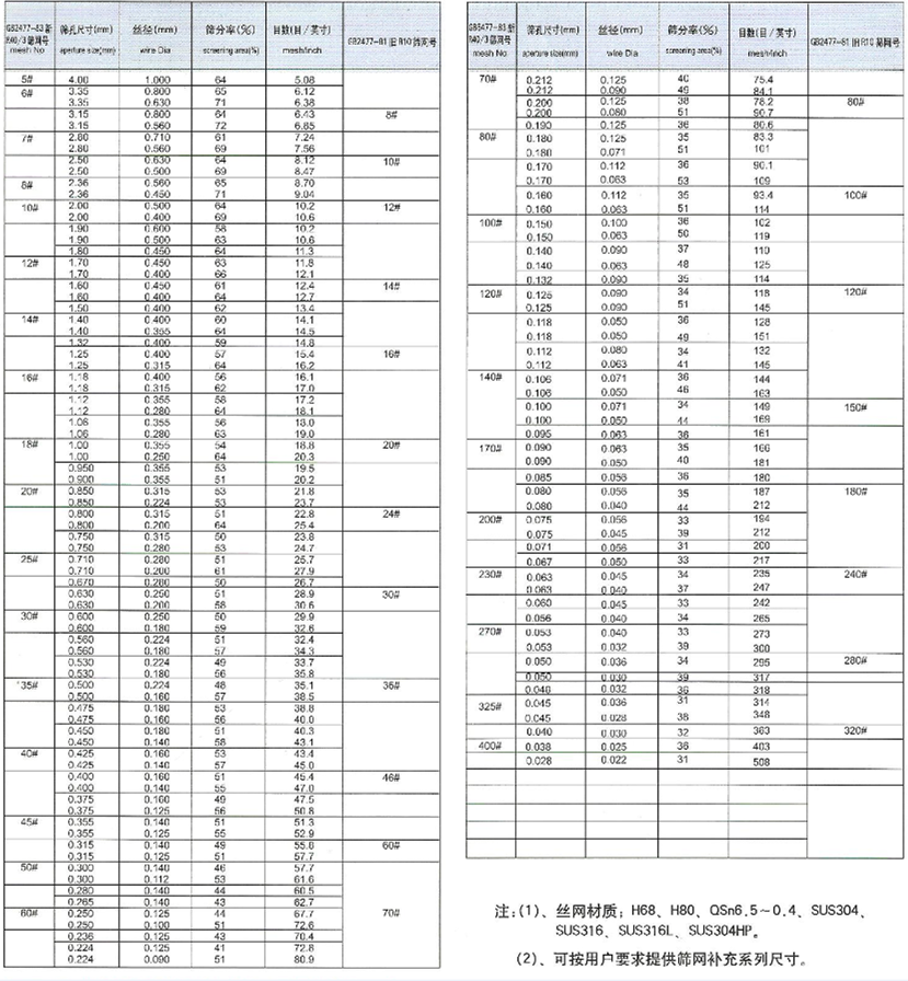 0.020mm(2.54~635目/英寸)網孔規格見表。